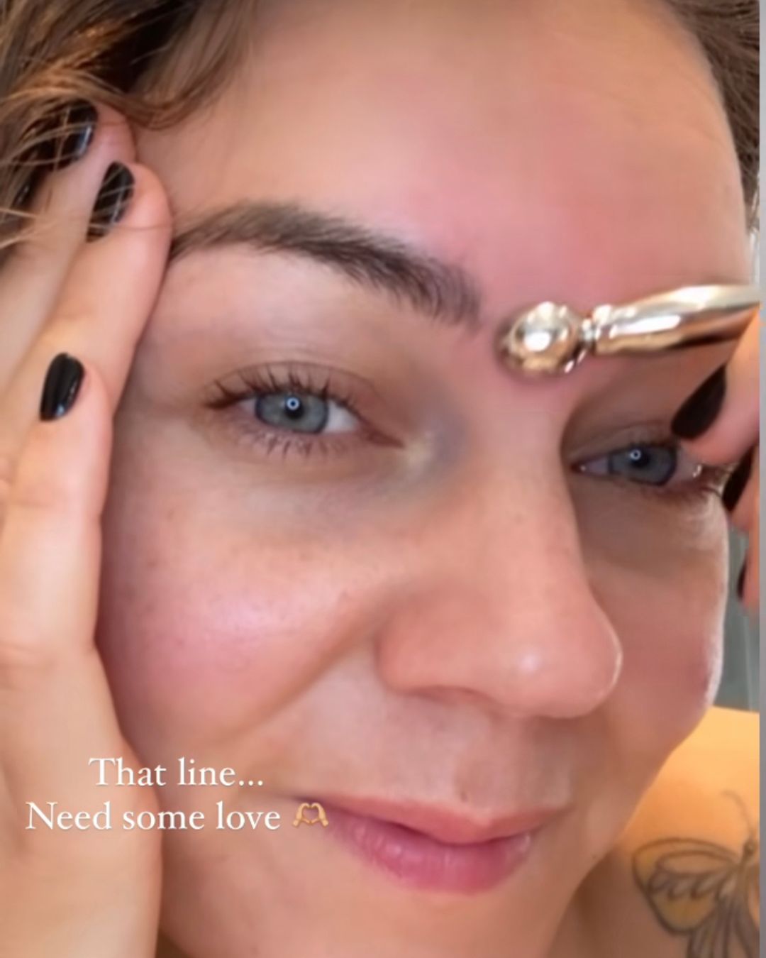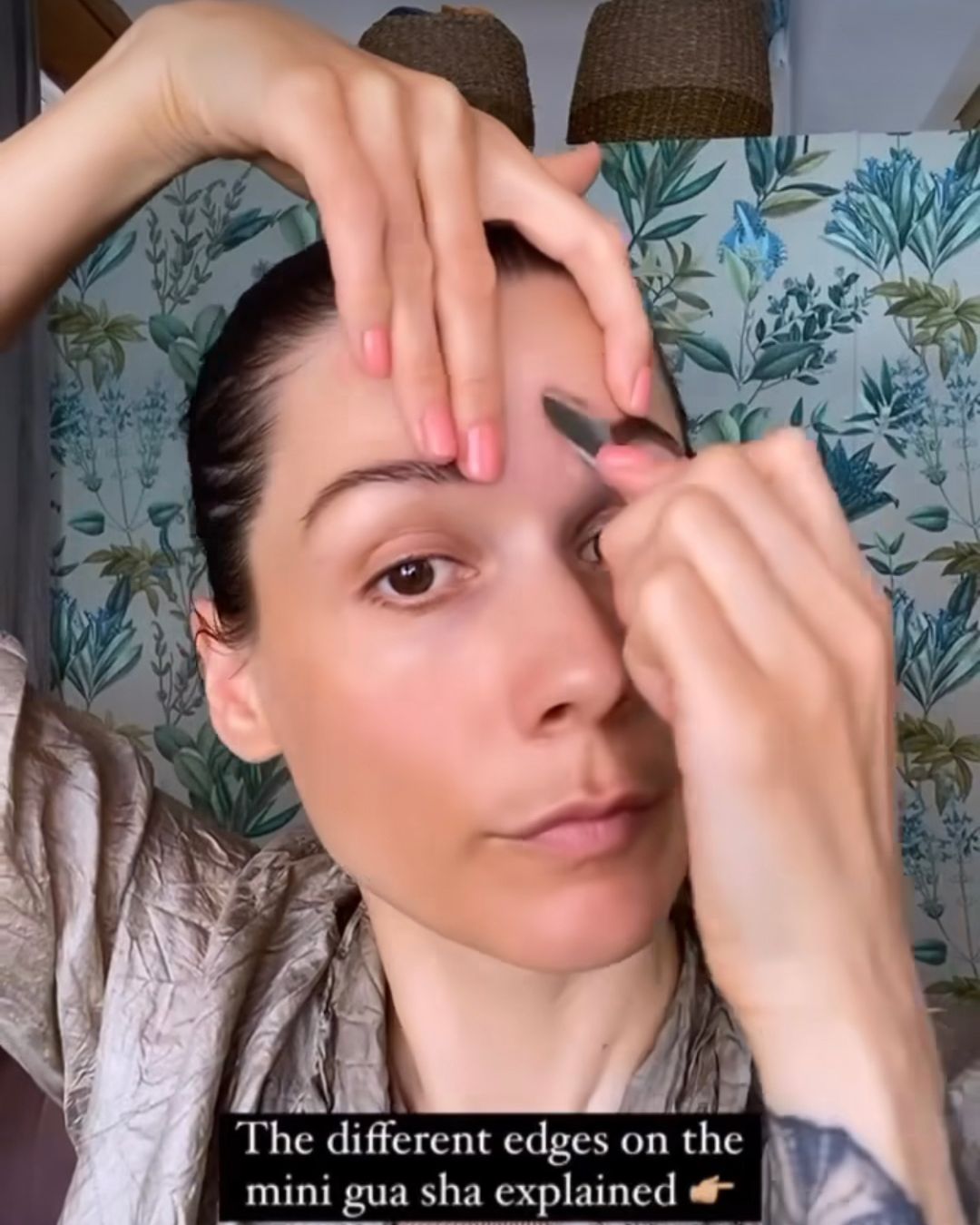 3. Next, using the side of the mini gua sha, scrape the opposite direction, creating more oxygen and blood circulation to the tissue around the wrinkle.